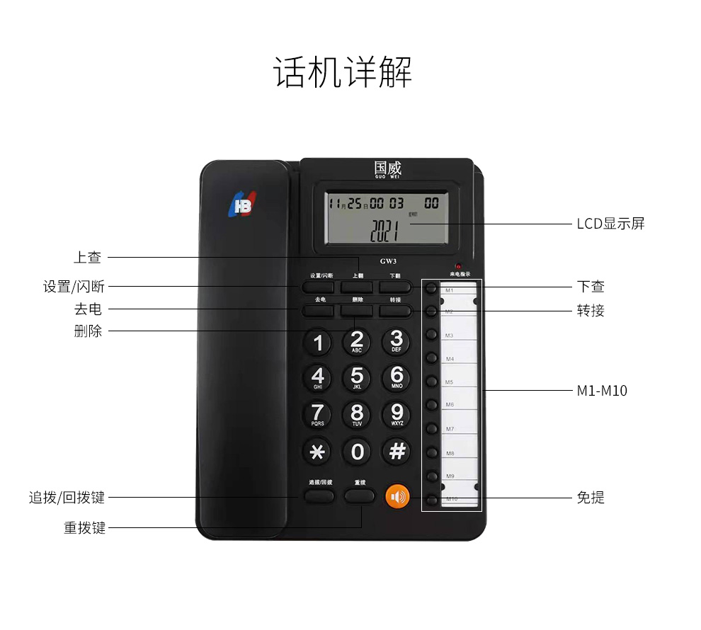 國威GW3具備強大的10組可自編輯存儲按鍵(M1-M10),用戶可以存儲常用號碼、或者部門電話,實現(xiàn)一鍵呼叫,避免重復(fù)撥號。