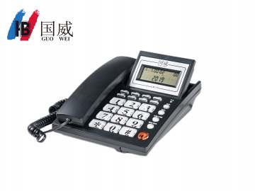 國威電話機,GW37,黑色雙接口座機電話,顯示屏可搖頭,國威辦公座機電話機支持25個鍵盤按鍵及來電提醒指示燈,透明大字體按鍵、具備上查、下查、去電、重撥、回撥、暫停、掛斷、設置、音量+、音量-、按鍵功能。