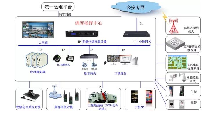 融合通信調度指揮系統由多媒體軟交換服務器、應用服務器、中繼網關、語音網關、調度臺等設備組成。同時本系統需與以下各個子系統對接: