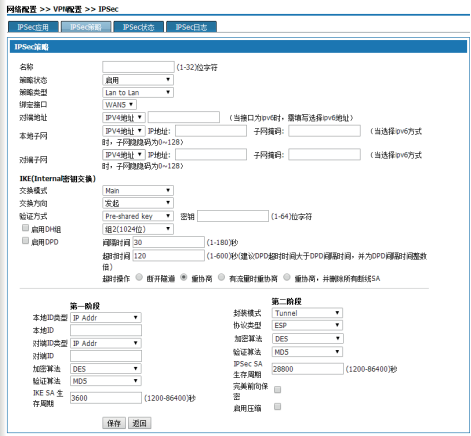 選擇“VPN配置>IPSec,單擊<IPSec策略>標簽,進入“IPSec策略頁面”如下圖所示。