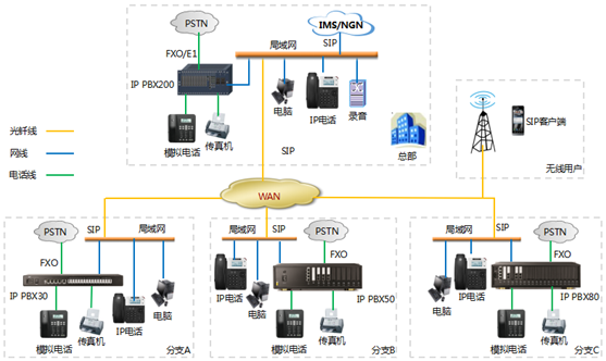 IP PBX200可作為核心軟交換設備放置在公司總部及重要分支機構,上行通過FXO/E1接入PSTN網絡或者經IP網絡接入IMS網絡。各分支機構使用模擬電話和IP電話等終端連接至各分支IP PBX,同時各分支IP PBX通過SIP中繼連接到總部IP PBX,實現公司所有電話終端內部通話零話費,撥打分支機構所在地市話無長途費等。